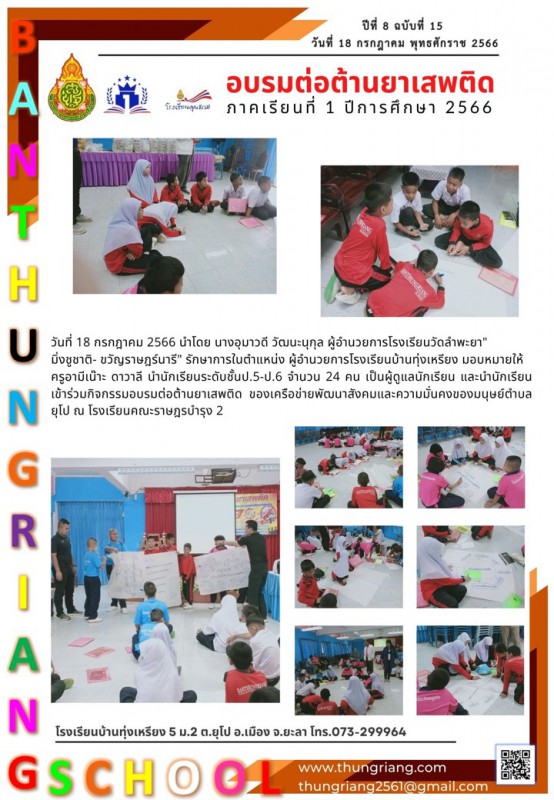 วัดลำพะยา"มิ่งชูชาติ- ขวัญราษฎร์นารี" รักษาการในตำแหน่ง ผู้อำนวยการโรงเรียนบ้านทุ่งเหรียง มอบหมายให้ครูอามีเน๊าะ ดาวาลี นำนักเรียนระดับชั้นป.5-ป.6 จำนวน 24 คน เป็นผู้ดูแลนักเรียน และนำนักเรียนเข้าร่วมกิจกรรมอบรมต่อต้านยาเสพติด ของเครือข่ายพัฒนาสังคมและความมั่นคงของมนุษย์ตำบลยุโป ณ โรงเรียนคณะราษฎรบำรุง 2