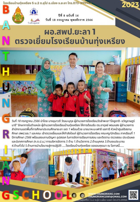 วัดลำพะยา"มิ่งชูชาติ- ขวัญราษฎร์นารี" รักษาการในตำแหน่ง ผู้อำนวยการโรงเรียนบ้านทุ่งเหรียง ให้การต้อนรับ ดร.อาดุลย์ พรมแสง ผู้อำนวยการสำนักงานเขตพื้นที่การศึกษาประถมศึกษายะลา เขต 1 พร้อมด้วย นายมาหะมะเฟาซี แซการี หัวหน้าศูนย์อิสลามศึกษา สพป.ยล.1 และคณะ เข้าตรวจเยี่ยมและให้กำลังใจแก่ ผู้อำนวยการโรงเรียน คณะครู/นักเรียน ภาคเรียนที่ 1 ปีการศึกษา 2566 พร้อมสอบถามปัญหา อุปสรรค ในการจัดการเรียนการสอน และติดตาม ตรวจสอบ ประเมินผลและนิเทศการศึกษา (ก.ต.ป.น.) การบริหารจัดการ 5 ด้าน