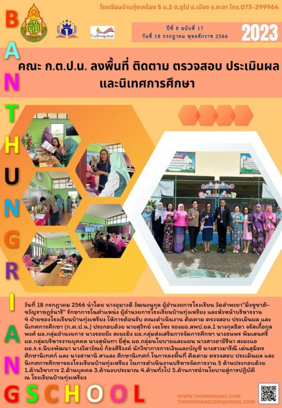 วัดลำพะยา"มิ่งชูชาติ- ขวัญราษฎร์นารี" รักษาการในตำแหน่ง ผู้อำนวยการโรงเรียนบ้านทุ่งเหรียง และหัวหน้าบริหารงาน 4 ฝ่ายของโรงเรียนบ้านทุ่งเหรียง ให้การต้อนรับ คณะดำเนินงาน ติดตาม ตรวจสอบ ประเมินผล และนิเทศการศึกษา (ก.ต.ป.น.) ประกอบด้วย นายสุวิทย์ เจะโซะ รองผอ.สพป.ยล.1 นางกุลธิดา จรัสเกื้อกูลพงศ์ ผอ.กลุ่มอำนวยการ นางรอยย๊ะ สะยะมิง ผอ.กลุ่มส่งเสริมการจัดการศึกษา นางธนพร พิมเสนศรี ผอ.กลุ่มบริหารงานบุคคล นางสุนันทา ยี่สุ่น ผอ.กลุ่มนโยบายและแผน นางสาวอายีรีนา สะมะแอ ผอ.ร.ร.นิบงพัฒนา นางวิลาวัณย์ ก้องศิริวงค์ นักวิชาการการเงินและบัญชี นางสาวมารีณี เด่นสุมิตร ศึกษานิเทศก์ และ นางสาหานิ สาและ ศึกษานิเทศก์ ในการลงพื้นที่ ติดตาม ตรวจสอบ ประเมินผล และนิเทศการศึกษาของโรงเรียนบ้านทุ่งเหรียง ในการดำเนินงานบริหารจัดการงาน 5 ด้านประกอบด้วย 1.ด้านวิชาการ 2.ด้านบุคคล 3.ด้านงบประมาณ 4.ด้านทั่วไป 5.ด้านการนำนโยบายสู่การปฏิบัติ ณ โรงเรียนบ้านทุ่งเหรียง