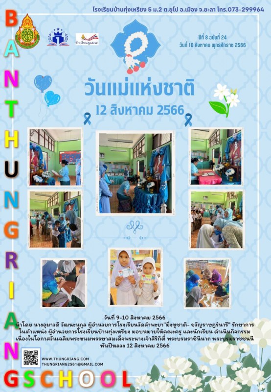 วัดลำพะยา"มิ่งชูชาติ- ขวัญราษฎร์นารี" รักษาการในตำแหน่ง ผู้อำนวยการโรงเรียนบ้านทุ่งเหรียง ให้คณะครู บุคลากรทางการศึกษา และนักเรียน ดำเนินกิจกรรมเนื่องในโอกาสวันเฉลิมพระชนมพรรษาสมเด็จพระนางเจ้าสิริกิติ์ พระบรมราชินีนาถ พระบรมราชชนนีพันปีหลวง 12 สิงหาคม 2566 ณ ห้องประชุมโรงเรียนบ้านทุ่งเหรียง