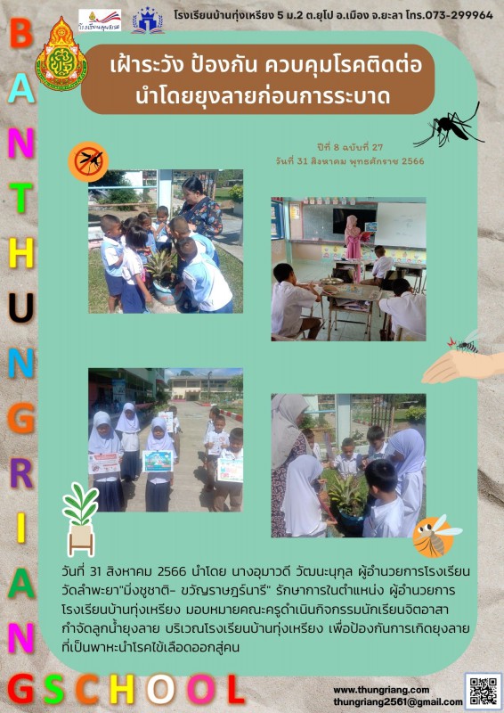 วัดลำพะยา"มิ่งชูชาติ- ขวัญราษฎร์นารี" รักษาการในตำแหน่ง ผู้อำนวยการโรงเรียนบ้านทุ่งเหรียง มอบหมายคณะครูดำเนินกิจกรรมนักเรียนจิตอาสากำจัดลูกน้ำยุงลาย บริเวณโรงเรียนบ้านทุ่งเหรียง เพื่อป้องกันการเกิดยุงลาย ที่เป็นพาหะนำโรคไข้เลือดออกสู่คน