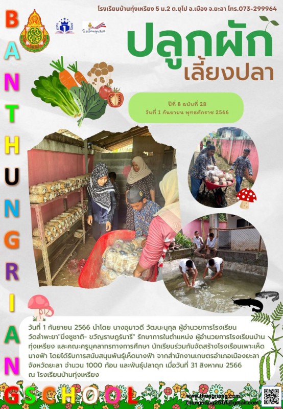 วัดลำพะยา"มิ่งชูชาติ- ขวัญราษฎร์นารี" รักษาการในตำแหน่ง ผู้อำนวยการโรงเรียนบ้านทุ่งเหรียง และคณะครูบุคลากรทางการศึกษา นักเรียนร่วมกันจัดสร้างโรงเรือนเพาะเห็ดนางฟ้า โดยได้รับการสนับสนุนพันธุ์เห็ดนางฟ้าจากสำนักงานเกษตรอำเภอเมืองยะลา จังหวัดยะลา จำนวน 1000 ก้อน และพันธุ์ปลาดุก เมื่อวันที่ 31 สิงหาคม 2566 ณ โรงเรียนบ้านทุ่งเหรียง