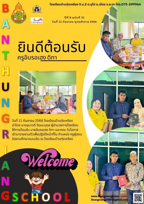 ให้การต้อนรับ นายอิบรอเฮง ดิกา และคณะ ในโอกาส เข้ามารายงานตัวเพื่อปฏิบัติหน้าที่ใน ตำแหน่งครูผู้สอนอิสลามศึกษาแบบเข้ม ณ โรงเรียนบ้านทุ่งเหรียง