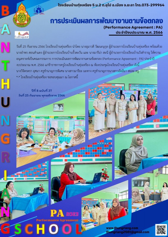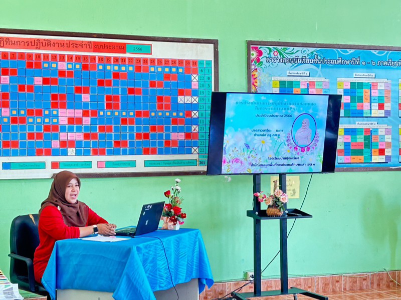 นางมารีน่า สะนี ผู้อำนวยการโรงเรียนบ้านวังสำราญ ให้ความอนุเคราะห์เป็นคณะกรรมการ การประเมินผลการพัฒนางานตามข้อตกลง (Performance Agreement : PA) ประจำปีงบประมาณ พ.ศ. 2566 แก่ข้าราชการครูโรงเรียนบ้านทุ่งเหรียง ณ ห้องประชุมโรงเรียนบ้านทุ่งเหรียง ดังนี้
