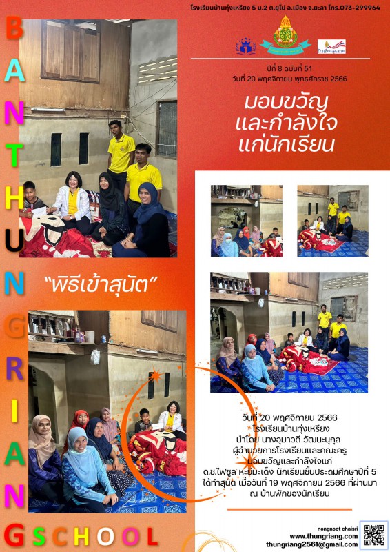 และคณะครู มอบขวัญและกำลังใจแก่ด.ช.ไฟซูล หะยีมะเด็ง นักเรียนชั้นประถมศึกษาปีที่ 5 ได้ทำสุนัตเมื่อวันที่ 19 พฤศจิกายน 2566 ที่ผ่านมา