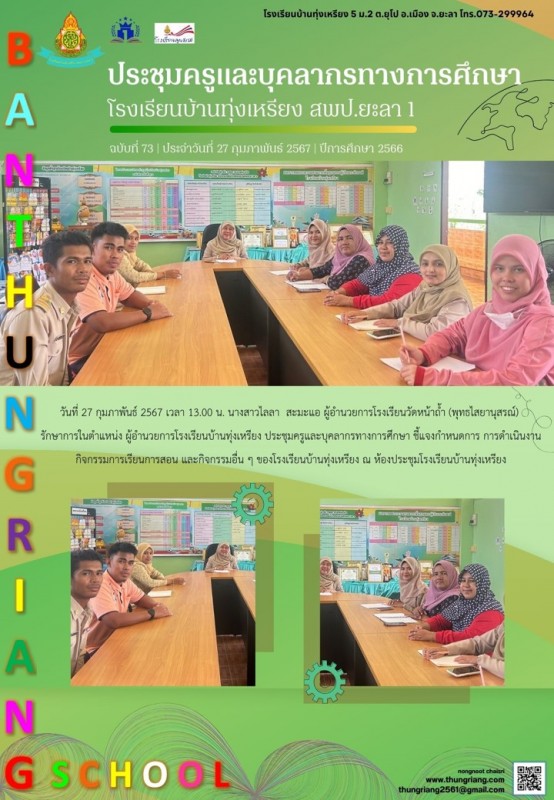 ประชุมครูและบุคลากรทางการศึกษา ชี้แจงกำหนดการ การดำเนินกิจกรรมต่าง ๆ ของโรงเรียนบ้านทุ่งเหรียง ณ ห้องประชุมโรงเรียนบ้านทุ่งเหรียง