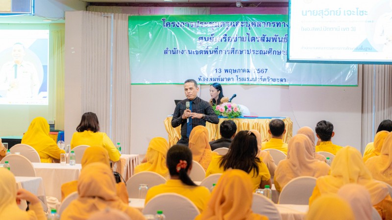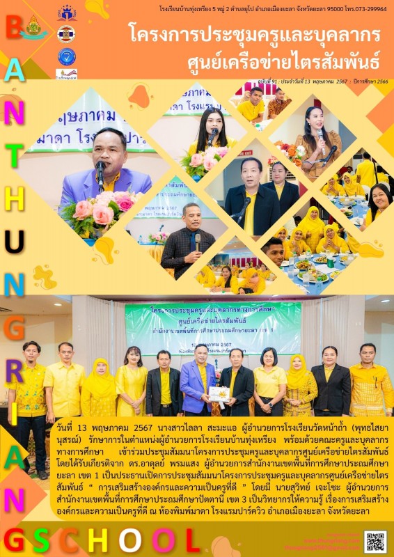 วันที่ 13 พฤษภาคม 2567 นางสาวไลลา สะมะแอ ผู้อำนวยการโรงเรียนวัดหน้าถ้ำ (พุทธไสยานุสรณ์) รักษาการในตำแหน่งผู้อำนวยการโรงเรียนบ้านทุ่งเหรียง พร้อมด้วยคณะครูและบุคลากรทางการศึกษา เข้าร่วมประชุมสัมมนาโครงการประชุมครูและบุคลากรศูนย์เครือข่ายไตรสัมพันธ์ โดยได้รับเกียรติจาก ดร.อาดุลย์ พรมแสง ผู้อำนวยการสำนักงานเขตพื้นที่การศึกษาประถมศึกษายะลา เขต 1 เป็นประธานเปิดการประชุมสัมมนาโครงการประชุมครูและบุคลากรศูนย์เครือข่ายไตรสัมพันธ์ “ การเสริมสร้างองค์กรและความเป็นครูที่ดี ” โดยมี นายสุวิทย์ เจะโซะ ผู้อำนวยการสำนักงานเขตพื้นที่การศึกษาประถมศึกษาปัตตานี เขต 3 เป็นวิทยากรให้ความรู้ เรื่องการเสริมสร้างองค์กรและความเป็นครูที่ดี ณ ห้องพิมพ์มาดา โรงแรมปาร์ควิว อำเภอเมืองยะลา จังหวัดยะลา |