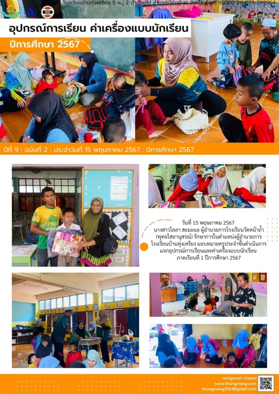 วันที่ 15 พฤษภาคม 2567 นางสาวไลลา สะมะแอ ผู้อำนวยการโรงเรียนวัดหน้าถ้ำ (พุทธไสยานุสรณ์) รักษาการในตำแหน่งผู้อำนวยการโรงเรียนบ้านทุ่งเหรียง มอบหมายครูประจำชั้นดำเนินการแจกอุปกรณ์การเรียนและค่าเครื่องแบบนักเรียน ภาคเรียนที่ 1 ปีการศึกษา 2567