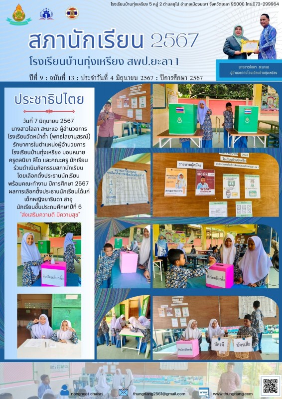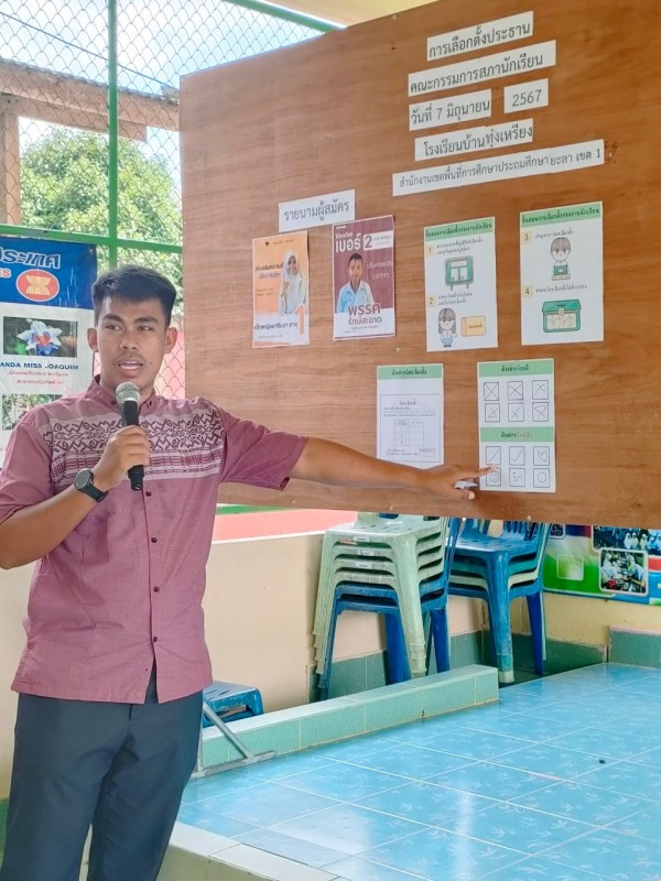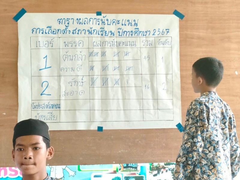 ครูดลนิยา ลีโด และคณะครู นักเรียน ร่วมดำเนินกิจกรรมเลือกตั้งประธานนักเรียน พร้อมคณะทำงาน ปีการศึกษา 2567 ผลการเลือกต้้งประธานนักเรียนได้แก่ เด็กหญิงยารินดา สาอุ นักเรียนชัั้นประถมศึกษาปีที่ 6