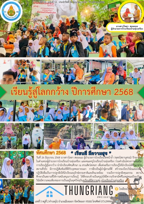 วันที่ 26 มิถุนายน 2568 นางสาวไลลา สะมะแอ ผู้อำนวยการโรงเรียนวัดหน้าถ้ำ (พุทธไสยานุสรณ์) รักษาการในตำแหน่งผู้อำนวยการโรงเรียนบ้านทุ่งเหรียง และคณะครูโรงเรียนบ้านทุ่งเหรียง ร่วมดำเนินโครงการส่งเสริมการเรียนรู้สู่โลกกว้าง นำนักเรียนทัศนศึกษา ณ สวนสัตว์สงขลา เพื่อส่งเสริมการเรียนรู้ให้นักเรียนได้ศึกษาจากสถานที่จริง มีการปฏิสัมพันธ์ที่ดีกับบุคคลภายนอก การฝึกเป็นผู้นำผู้ตามที่ดี สร้างระเบียบวินัยและลงมือปฏิบัติเพื่อเป็นการปลูกฝังให้นักเรียนอนุรักษ์ธรรมชาติและสิ่งแวดล้อม รวมถึงการปลูกฝังคุณธรรม สถานศึกษาเป็นสถานที่ให้การสนับสนุนการเรียนรู้ ให้สิ่งรอบข้างเป็นครูมุ่งให้มีความรักสามัคคีในหมู่คณะมีระเบียบวินัยมีความพอเพียงของการเป็นอยู่ในยุคปัจจุบัน #เรียนดีมีความสุข #โรงเรียนบ้านทุ่งเหรียง