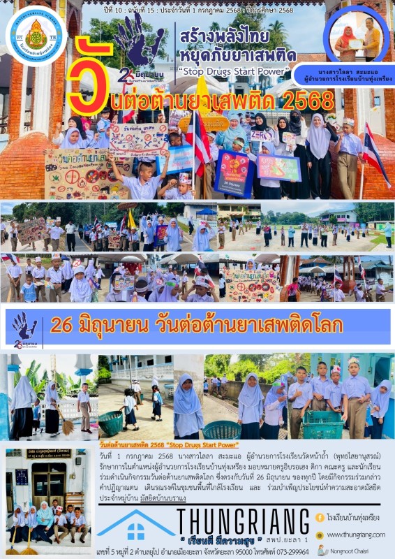 วันที่ 1 กรกฎาคม 2568 นางสาวไลลา สะมะแอ ผู้อำนวยการโรงเรียนวัดหน้าถ้ำ (พุทธไสยานุสรณ์) รักษาการในตำแหน่งผู้อำนวยการโรงเรียนบ้านทุ่งเหรียง มอบหมายครูอิบรอเฮง ดิกาและคณะครู และนักเรียน ร่วมดำเนินกิจกรรมวันต่อต้านยาเสพติดโลก โดยมีกิจกรรมร่วมกล่าวคำปฏิญาณตน เดินรณรงค์ในชุมชนพื้นที่ใกล้โรงเรียน และ ร่วมบำเพ็ญประโยชน์ทำความสะอาดมัสยิดประจำหมู่บ้าน #มัสยิดบ้านบราแง