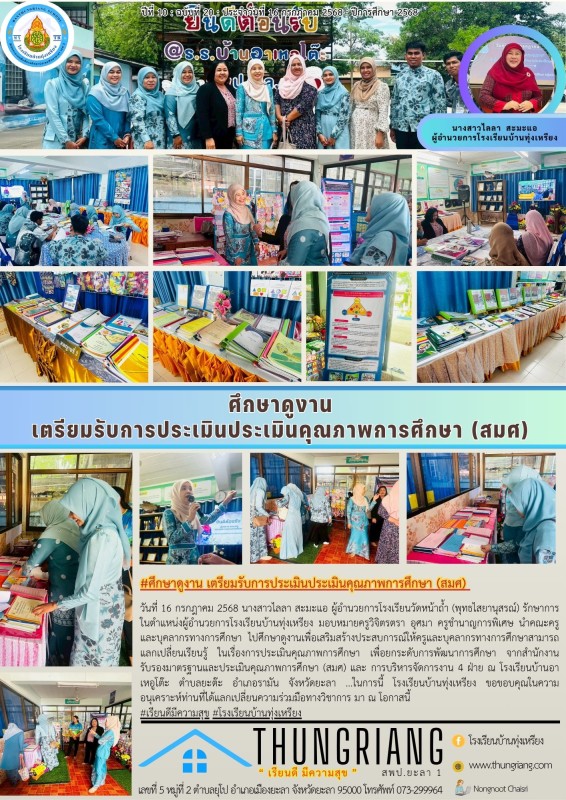 วันที่ 16 กรกฎาคม 2568 นางสาวไลลา สะมะแอ ผู้อำนวยการโรงเรียนวัดหน้าถ้ำ (พุทธไสยานุสรณ์) รักษาการในตำแหน่งผู้อำนวยการโรงเรียนบ้านทุ่งเหรียง มอบหมายครูวิจิตรตรา อุศมา ครูชำนาญการพิเศษ นำคณะครูและบุคลากรทางการศึกษา ไปศึกษาดูงานเพื่อเสริมสร้างประสบการณ์ให้ครูและบุคลากรทางการศึกษาสามารถแลกเปลี่ยนเรียนรู้ ในเรื่องการประเมินคุณภาพการศึกษา เพื่อยกระดับการพัฒนาการศึกษา จากสำนักงานรับรองมาตรฐานและประเมินคุณภาพการศึกษา (สมศ) และ การบริหารจัดการงาน 4 ฝ่าย ณ โรงเรียนบ้านอาเหอูโต๊ะ ตำบลยะต๊ะ อำเภอรามัน จังหวัดยะลา