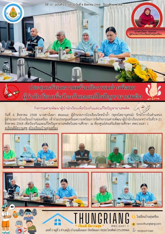 วันที่ 6 สิงหาคม 2568 นางสาวไลลา สะมะแอ ผู้อำนวยการโรงเรียนวัดหน้าถ้ำ (พุทธไสยานุสรณ์) รักษาการในตำแหน่งผู้อำนวยการโรงเรียนบ้านทุ่งเหรียง เข้าร่วมประชุมเตรียมความพร้อมการจัดกิจกรรมค่ายพัฒนาผู้นำนักเรียนระหว่างวันที่ 19-21 สิงหาคม 2568 เพื่อป้องกันและแก้ไขปัญหายาเสพติดในสถานศึกษา ณ ห้องศูนย์ส่งเสริมอิสลามศึกษา สพป.ยะลา 1
