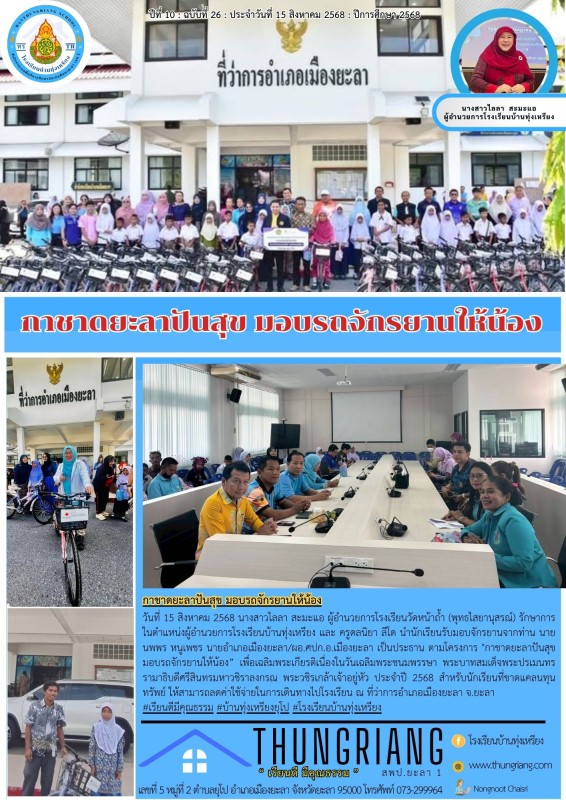 ตามโครงการ "กาชาดยะลาปันสุข มอบรถจักรยานให้น้อง” เพื่อเฉลิมพระเกียรติเนื่องในวันเฉลิมพระชนมพรรษา พระบาทสมเด็จพระปรเมนทรรามาธิบดีศรีสินทรมหาวชิราลงกรณ พระวชิรเกล้าเจ้าอยู่หัว ประจำปี 2568 สำหรับนักเรียนที่ขาดแคลนทุนทรัพย์ ให้สามารถลดค่าใช้จ่ายในการเดินทางไปโรงเรียน ณ ที่ว่าการอำเภอเมืองยะลา จ.ยะลา