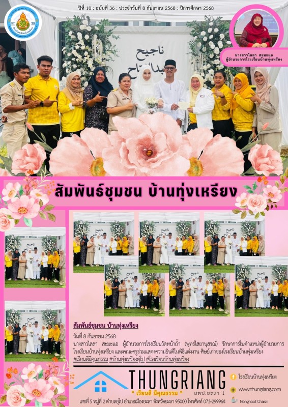 นางสาวไลลา สะมะแอ ผู้อำนวยการโรงเรียนวัดหน้าถ้ำ (พุทธไสยานุสรณ์) รักษาการในตำแหน่งผู้อำนวยการโรงเรียนบ้านทุ่งเหรียง และคณะครูร่วมแสดงความยินดีในพิธีแต่งงาน ศิษย์เก่าของโรงเรียนบ้านทุ่งเหรียง