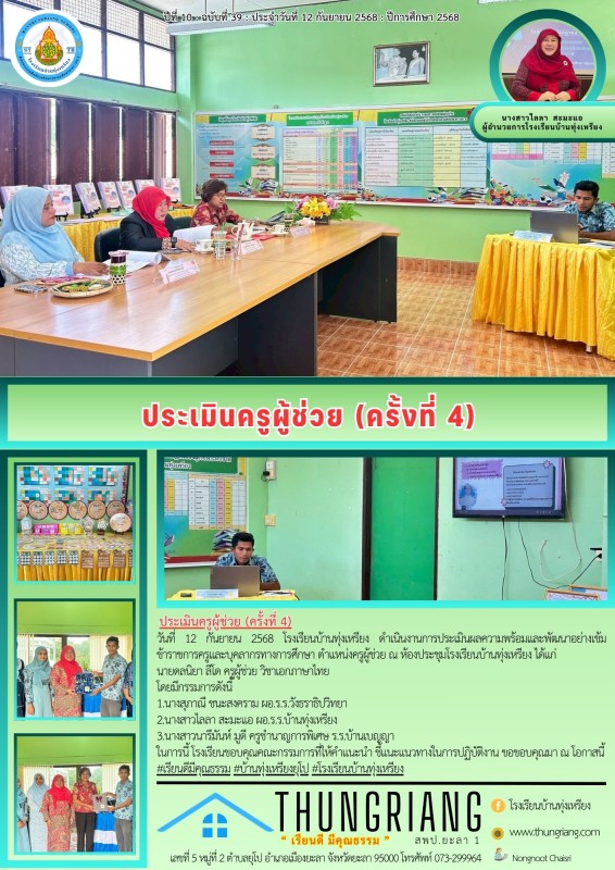 วันที่ 12 กันยายน 2568 โรงเรียนบ้านทุ่งเหรียง ดำเนินงานการประเมินผลความพร้อมและพัฒนาอย่างเข้ม ข้าราชการครูและบุคลากรทางการศึกษา ตำแหน่งครูผู้ช่วย ณ ห้องประชุมโรงเรียนบ้านทุ่งเหรียง ได้แก่