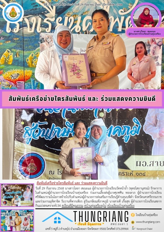 วันที่ 29 กันยายน 2568 นางสาวไลลา สะมะแอ ผู้อำนวยการโรงเรียนวัดหน้าถ้ำ (พุทธไสยานุสรณ์) รักษาการในตำแหน่งผู้อำนวยการโรงเรียนบ้านทุ่งเหรียง ร่วมงานเลี้ยงส่งผู้นางศุภศศิน ทองลาภ ผู้อำนวยการโรงเรียนศรีพัฒนาราม ในโอกาสย้ายไปรับ ตำแหน่งผู้อำนวยการส่งเสริมการเรียนรู้ ตำบลนบพิตำ จังหวัดนครศรีธรรมราช