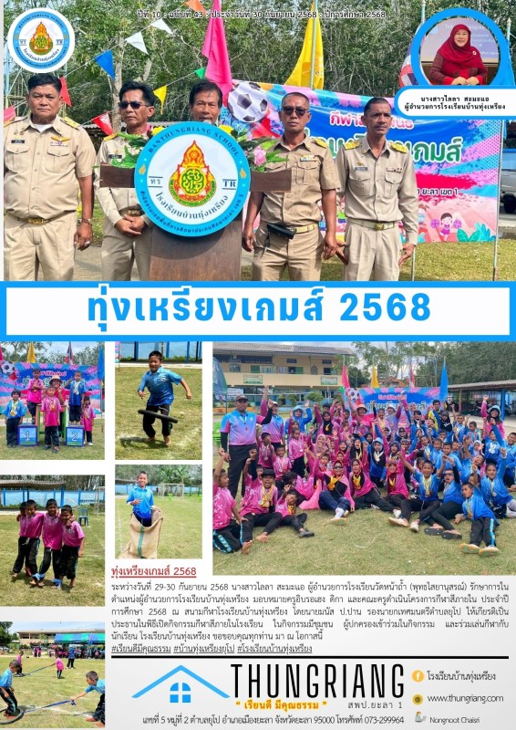 ระหว่างวันที่ 29-30 กันยายน 2568 นางสาวไลลา สะมะแอ ผู้อำนวยการโรงเรียนวัดหน้าถ้ำ (พุทธไสยานุสรณ์) รักษาการในตำแหน่งผู้อำนวยการโรงเรียนบ้านทุ่งเหรียง มอบหมายครูอิบรอเฮง ดิกา และคณะครูดำเนินโครงการกีฬาสีภายใน ประจำปีการศึกษา 2568 ณ สนามกีฬาโรงเรียนบ้านทุ่งเหรียง โดยนายมนัส ป.ปาน รองนายกเทศมนตรีตำบลยุโป