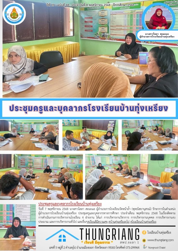 นางสาวไลลา สะมะแอ ผู้อำนวยการโรงเรียนวัดหน้าถ้ำ (พุทธไสยานุสรณ์) รักษาการในตำแหน่งผู้อำนวยการโรงเรียนบ้านทุ่งเหรียง ประชุมครูและบุคลากรทางการศึกษา ประจำเดือน พฤศจิกายน 2568 ในเรื่องติดตามการดำเนินงานการบริหารงานโรงเรียน 4 ฝ่ายงาน ได้แก่ การบริหารงานวิชาการ การบริหารงานบุคคล การบริหารงานงบประมาณ และการบริหารงานทั่วไป และอื่นๆ