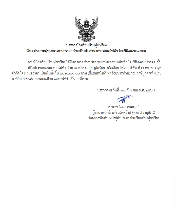 โรงเรียนบ้านทุ่งเหรียง ได้มีโครงการ จ้างปรับปรุงซ่อมแชมระบบไฟฟ้า โดยวิธีเฉพาะเจาะจง นั้น