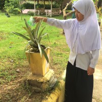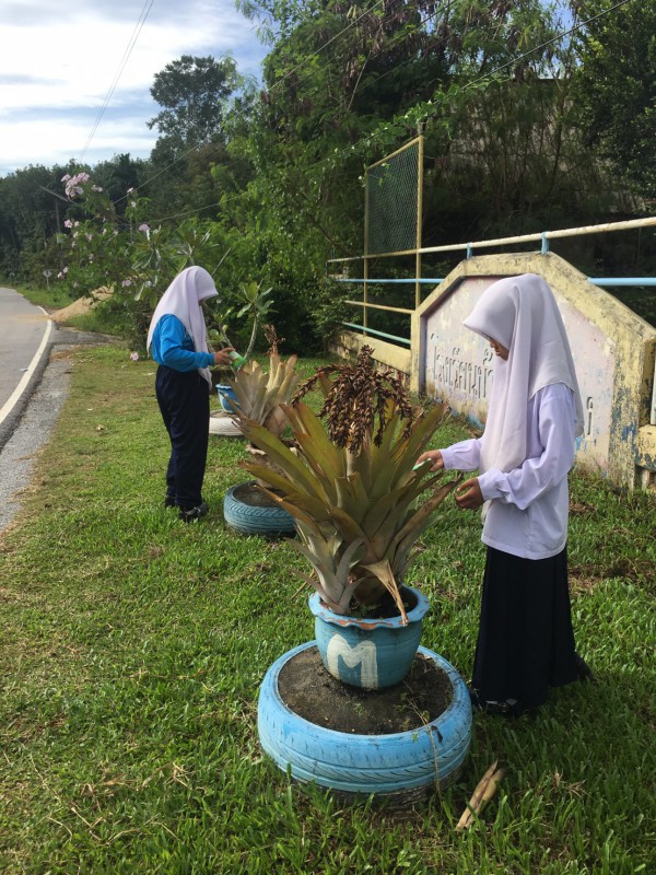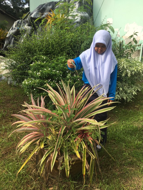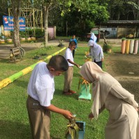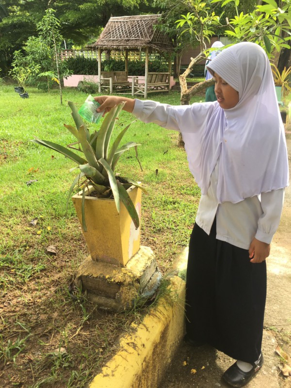 นักเรียนและครูโรงเรียนบ้านทุ่งเหรียง ร่วมกันดูแลบริเวณโรงเรียนใส่ทรายอะเบทในต้นสัปรดสี เพื่อป้องกันยุงลาย