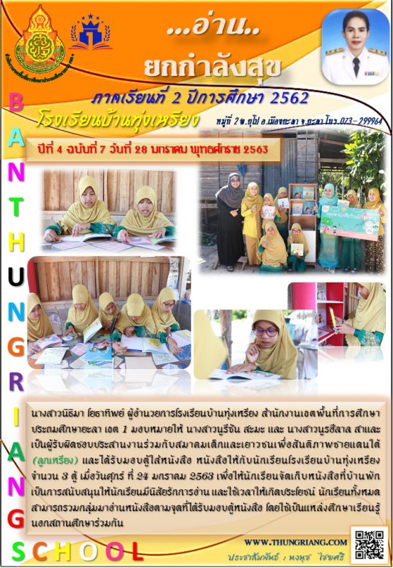 นางสาวนิธิมา โยธาทิพย์ ผู้อำนวยการโรงเรียนบ้านทุ่งเหรียง สำนักงานเขตพื้นที่การศึกษาประถมศึกษายะลา เขต 1 มอบหมายให้ นางสาวนูรีซัน สะมะ และ นางสาวนูรฮีลาล สาและ เป็นผู้รับผิดชอบประสานงานร่วมกับสมาคมเด็กและเยาวชนเพื่อสันติภาพชายแดนใต้ (ลูกเหรียง) และได้รับมอบตู้ใส่หนังสือ หนังสือให้กับนักเรียนโรงเรียนบ้านทุ่งเหรียง จำนวน 3 ตู้ เมื่อวันศุกร์ ที่ 24 มกราคม 2563 เพื่อให้นักเรียนจัดเก็บหนังสือที่บ้านพัก เป็นการสนับสนุนให้นักเรียนมีนิสัยรักการอ่าน และใช้เวลาให้เกิดประโยชน์ นักเรียนทั้งหมดสามารถรวมกลุ่มมาอ่านหนังสือตามจุดที่ได้รับมอบตู้หนังสือ โดยใช้เป็นแหล่งศึกษาเรียนรู้นอกสถานศึกษาร่วมกัน