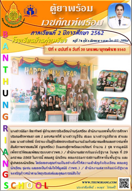 นางสาวนิธิมา โยธาทิพย์ ผู้อำนวยการโรงเรียนบ้านทุ่งเหรียง สำนักงานเขตพื้นที่การศึกษาประถมศึกษายะลา เขต 1 มอบหมายให้ นางสาวนูรีซัน สะมะ นางสาวนูรฮีลาล สาและ และ นางสาวอัยณี บือราแง เป็นผู้รับผิดชอบประสานงานร่วมกับสมาคมเด็กและเยาวชนเพื่อสันติภาพชายแดนใต้ (ลูกเหรียง) รับมอบตู้ยาพร้อมเวชภัณฑ์ จำนวน 1 ชุด จากมูลนิธิเพื่อการวิจัยและพัฒนาระบบยา(วพย.) / สำนักงานสลากกินแบ่งรัฐบาล วันพุธ ที่ 29 มกราคม 2563 ในการนี้ คณะครู นักเรียน คณะกรรมการสถานศึกษา้ขั้นพื้นฐาน และผู้ปกครองนักเรียน ใคร่ขอขอบคุณท่านเป็นอย่างยิ่งที่ให้ความสำคัญกับโรงเรียน คณะครู นักเรียน ชุมชน และขอเป็นกำลังใจให้มูลนิธิ (วพย.) / สำนักงานสลากกินแบ่งรัฐบาล จงเจริญก้าวหน้าตามวัตถุประสงค์และอุดมการณ์สืบไป