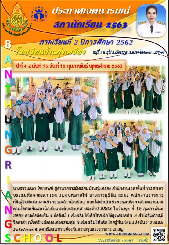 นางสาวนิธิมา โยธาทิพย์ ผู้อำนวยการโรงเรียนบ้านทุ่งเหรียง สำนักงานเขตพื้นที่การศึกษาประถมศึกษายะลา เขต 1มอบหมายให้ นางสาวนูรีซัน สะมะ พนักงานราชการ เป็นผู้รับผิดชอบงานกิจกรรมสภานักเรียน และได้ดำเนินกิจกรรมประกาศเจตนารมณ์ตามข้อคิดเห็นสภานักเรียน ระดับประเทศ ประจำปี 2563 ในวันพุธ ที่ 12 กุมภาพันธ์ 2563 ตามข้อคิดเห็น 4 ข้อดังนี้