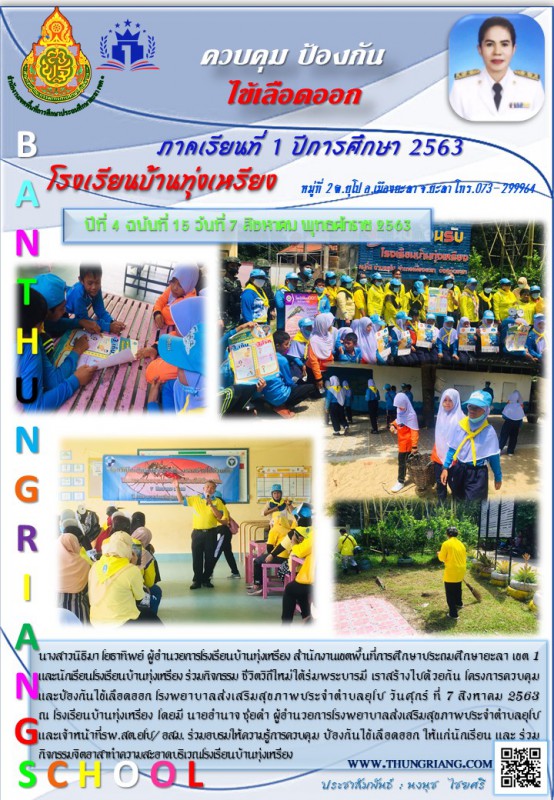 นางสาวนิธิมา โยธาทิพย์ ผู้อำนวยการโรงเรียนบ้านทุ่งเหรียง สำนักงานเขตพื้นที่การศึกษาประถมศึกษายะลา เขต 1 และนักเรียนโรงเรียนบ้านทุ่งเหรียง ร่วมกิจกรรม ชีวิตวิถีใหม่ใต้ร่มพระบารมี เราสร้างไปด้วยกัน โครงการควบคุม และป้องกันไข้เลือดออก โรงพยาบาลส่งเสริมสุขภาพประจำตำบลยุโป วันศุกร์ ที่ 7 สิงหาคม 2563 ณ โรงเรียนบ้านทุ่งเหรียง โดยมี นายอำนาจ ซุ่ยดำ ผู้อำนวยการโรงพยาบาลส่งเสริมสุขภาพประจำตำบลยุโป และเจ้าหน้าที่รพ.สต.ยโป/ อสม. ร่วมอบรมให้ความรู้การควบคุม ป้องกันไข้เลือดออก ให้แก่นักเรียน และ ร่วมกิจกรรมจิตอาสาทำความสะอาดบริเวณโรงเรียนบ้านทุ่งเหรียง