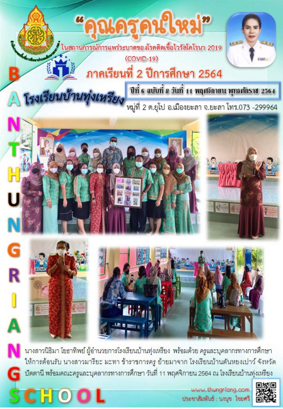 นางสาวนิธิมา โยธาทิพย์ ผู้อำนวยการโรงเรียนบ้านทุ่งเหรียง พร้อมด้วย ครูและบุคลากรทางการศึกษาให้การต้อนรับ นางสาวมารียะ มะทา ข้าราชการครู ย้ายมาจาก โรงเรียนบ้านตันหยงเปาว์ จังหวัดปัตตานี พร้อมคณะครูและบุคลากรทางการศึกษา วันที่ 11 พฤศจิกายน 2564 ณ โรงเรียนบ้านทุ่งเหรียง |