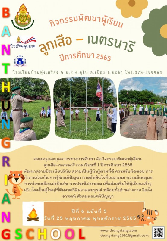 คณะครูและบุคลากรทางการศึกษา จัดกิจกรรมพัฒนาผู้เรียน ลูกเสือ-เนตรนารี ภาคเรียนที่ 1 ปีการศึกษา 2565 เพื่อพัฒนาความมีระเบียบวินัย ความเป็นผู้นำผู้ตามที่ดี ความรับผิดชอบ การทำงานร่วมกัน การรู้จักแก้ปัญหา การตัดสินใจที่เหมาะสม ความมีเหตุผล การช่วยเหลือแบ่งปันกัน การประนีประนอม เพื่อส่งเสริมให้ผู้เรียนเจริญเติบโตเป็นผู้ใหญ่ที่มีความที่มีความสมบูรณ์ พร้อมทั้งด้านร่างกาย จิตใจ อารมณ์ สังคมและสติปัญญา