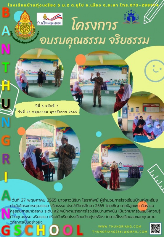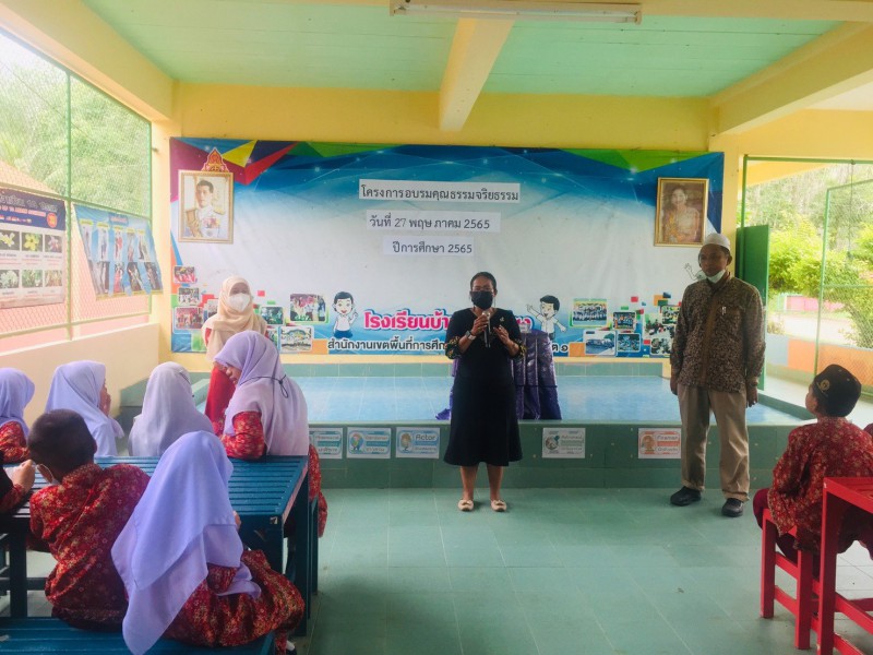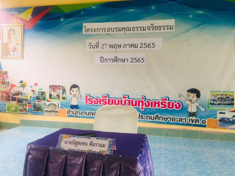 วันที่ 27 พฤษภาคม 2565นางสาวนิธิมา โยธาทิพย์ ผู้อำนวยการโรงเรียนบ้านทุ่งเหรียง ดำเนินโครงการคุณธรรม จริยธรรม ประจำปีการศึกษา 2565โดยเชิญ นายนิฮูสเซน ดือราแม ครูสอนศาสนาอิสลาม ระดับ ส2