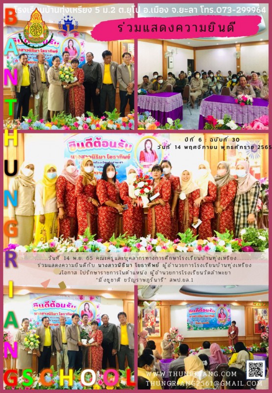 ........วันที่ 14 พ.ย. 65 คณะครูและบุคลากรทางการศึกษาโรงเรียนบ้านทุ่งเหรียง......... ร่วมแสดงความยินดีกับ นางสาวนิธิมา โยธาทิพย์ ผู้อำนวยการโรงเรียนบ้านทุ่งเหรียง ในโอกาส ไปรักษาราชการในตำแหน่ง ผู้อำนวยการโรงเรียนวัดลำพะยา “มิ่งชูชาติ ขวัญราษฎร์นารี” สพป.ยล.1