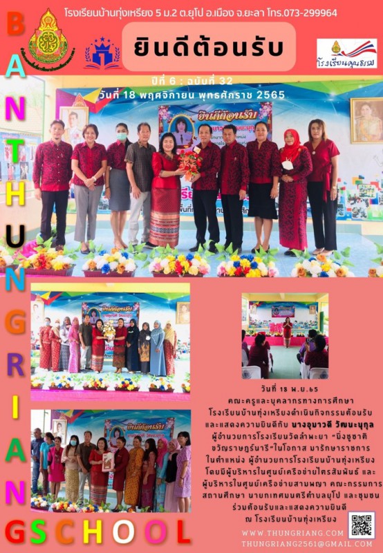 วันที่ 18 พ.ย.65 คณะครูและบุคลากรทางการศึกษา โรงเรียนบ้านทุ่งเหรียงดำเนินกิจกรรมต้อนรับ และแสดงความยินดีกับ นางอุมาวดี วัฒนะนุกุล ผู้อำนวยการโรงเรียนวัดลำพะยา “มิ่งชูชาติ ขวัญราษฎร์นารี”ในโอกาส มารักษาราชการ ในตำแหน่ง ผู้อำนวยการโรงเรียนบ้านทุ่งเหรียง โดยมีผู้บริหารในศูนย์เครือข่ายไตรสัมพันธ์ และ ผู้บริหารในศูนย์เครือข่ายสามพญา คณะกรรมการสถานศึกษา นายกเทศมนตรีตำบลยุโป และชุมชน ร่วมต้อนรับและแสดงความยินดี ณ โรงเรียนบ้านทุ่งเหรียง