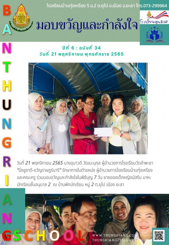 วันที่ 21 พฤศจิกายน 2565 นางอุมาวดี วัฒนะนุกุล ผู้อำนวยการโรงเรียนวัดลำพะยา “มิ่งชูชาติ-ขวัญราษฎร์นารี” รักษาการในตำแหน่ง ผู้อำนวยการโรงเรียนบ้านทุ่งเหรียง และคณะครู ร่วมมอบขวัญและกำลังใจในพิธีบุญ 7 วัน ยายของเด็กหญิงนัสรีน มาหะ นักเรียนชั้นอนุบาล 2 ณ บ้านพักนักเรียน หมู่ 2 ต.ยุโป เมือง ยะลา