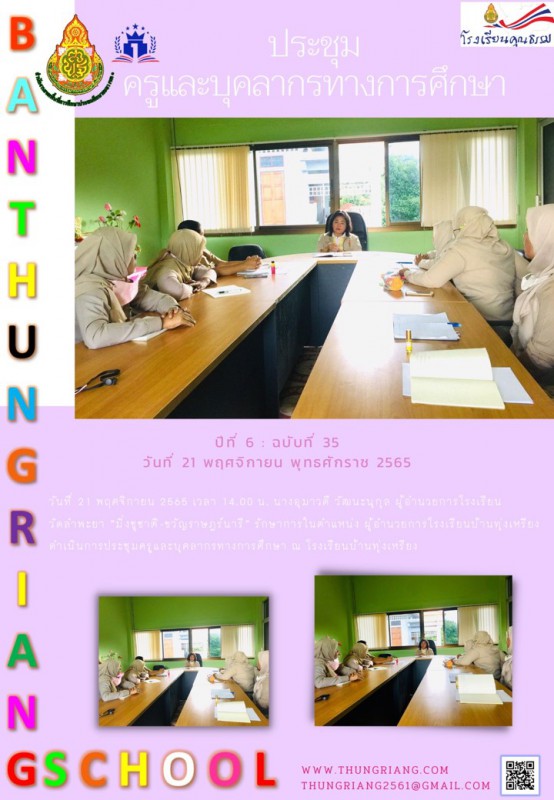 วันที่ 21 พฤศจิกายน 2565 เวลา 14.00 น. นางอุมาวดี วัฒนะนุกุล ผู้อำนวยการโรงเรียน วัดลำพะยา “มิ่งชูชาติ-ขวัญราษฎร์นารี” รักษาการในตำแหน่ง ผู้อำนวยการโรงเรียนบ้านทุ่งเหรียง ดำเนินการประชุมครูและบุคลากรทางการศึกษา ณ โรงเรียนบ้านทุ่งเหรียง