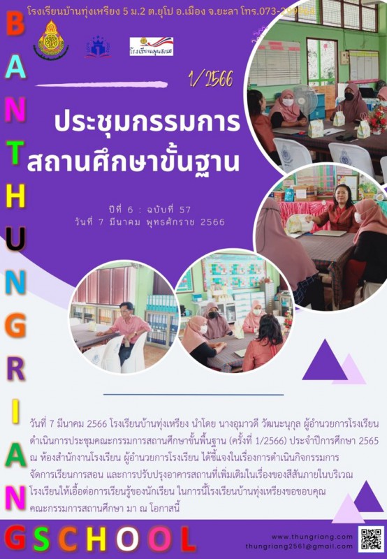 วันที่ 7 มีนาคม 2566 โรงเรียนบ้านทุ่งเหรียง นำโดย นางอุมาวดี วัฒนะนุกุล ผู้อำนวยการโรงเรียน ดำเนินการประชุมคณะกรรมการสถานศึกษาขั้นพื้นฐาน