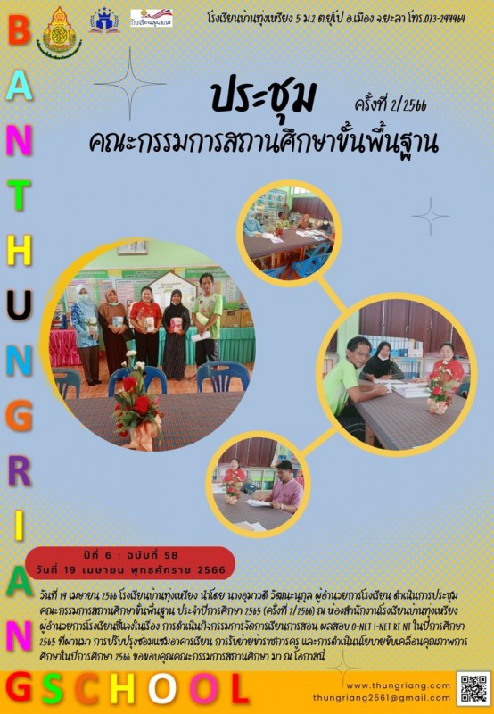 วันที่ 19 เมษายน 2566 โรงเรียนบ้านทุ่งเหรียง นำโดย นางอุมาวดี วัฒนะนุกุล ผู้อำนวยการโรงเรียน ดำเนินการประชุมคณะกรรมการสถานศึกษาขั้นพื้นฐาน ประจำปีการศึกษา 2565 (ครั้งที่ 2/2566) ณ ห้องสำนักงานโรงเรียน